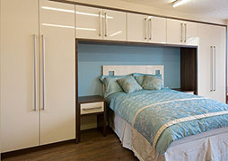 Range of full height white gloss finish units, built-under Liebherr freezer, full height pull-out vertical storage trays, Full height sliding doors to coat / storage area. Radiator & extractor fan. double wardrobes with cupboards above, bridging cupboards and bed-head. ... Access Doc